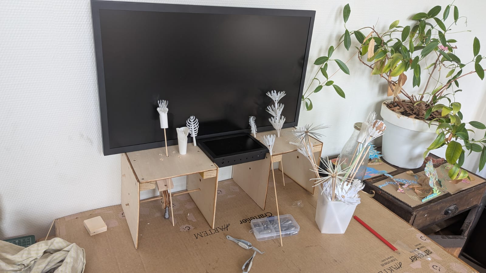 Carbone 14 est une nouvelle création en cours de production par les Yeux d’Argos. Elle se composera d’une collection de 3 à 4 vivariums représentant différents moments de l’histoire de la planète, correspondant a l’apparition de différentes formes de vie. Plusieurs ères seront représentées : le Cambrien, le Paléozoïque, le Mésozoïque et le Cénozoïque… Les vivariums se déploient face au public avec une vidéo lumineuse en fond qui révèle le paysage géologique, tandis que des automates en papier font émerger les formes de vie animale.